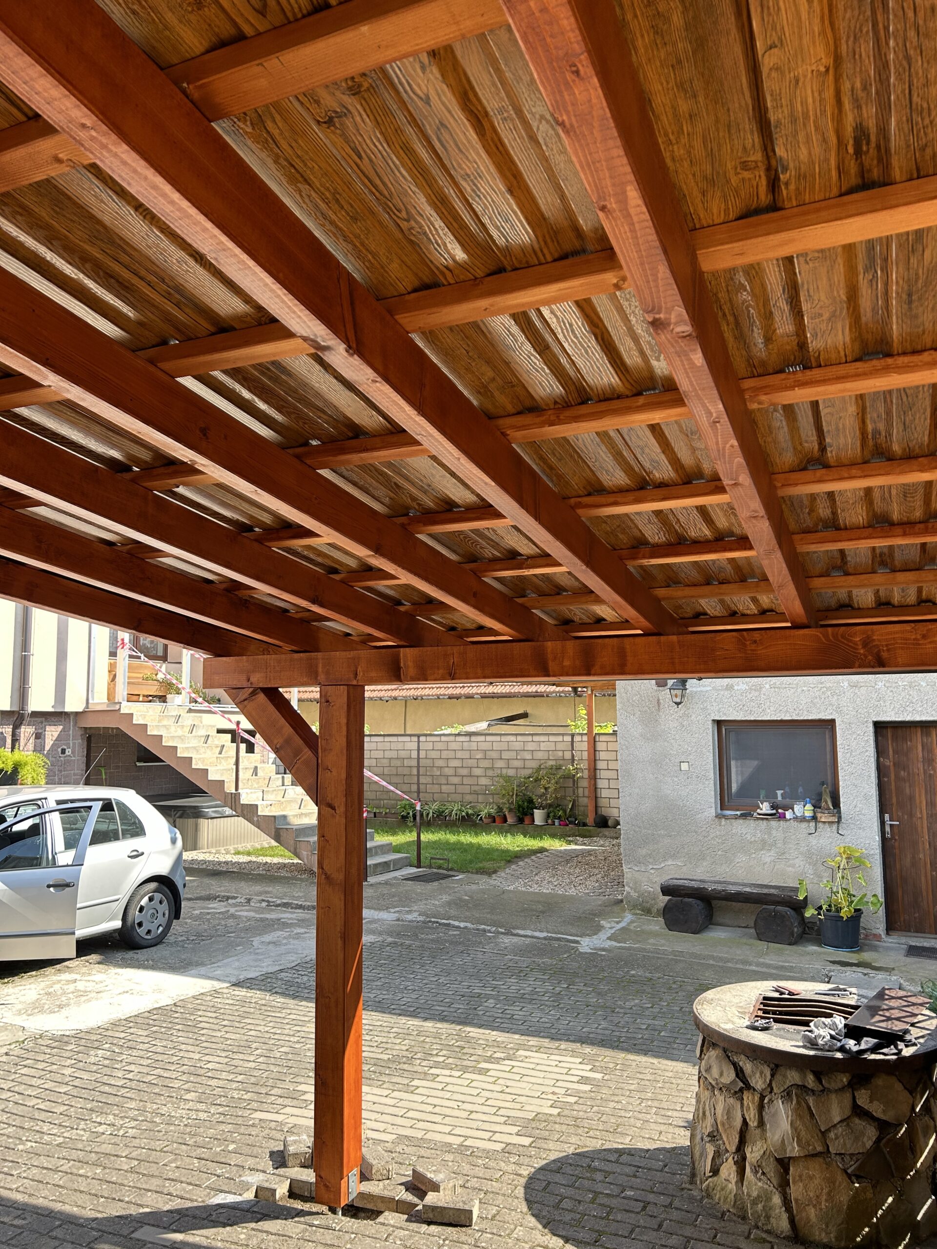 Realizace dřevěného přístřešku v Topolné. Přístřešek je z KVH hranolů natřených kaštanovou lazurou.